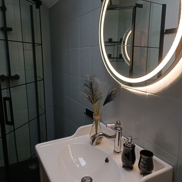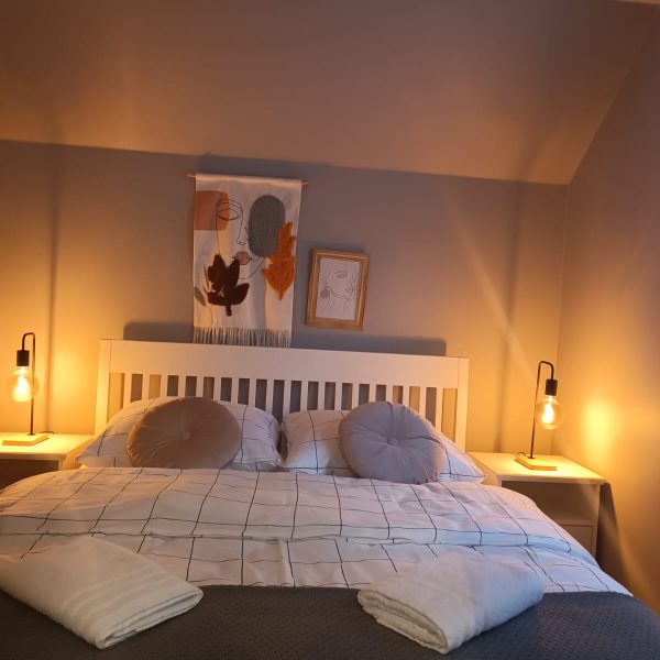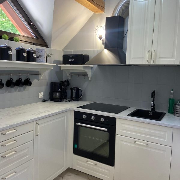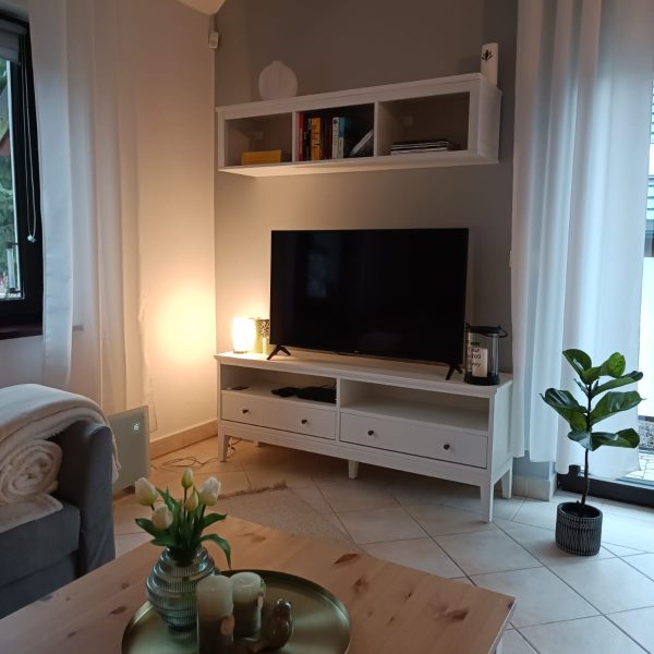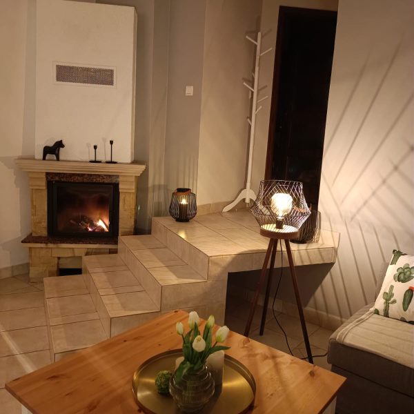 Jednym z największych atutów Domku Premium jest przytulny kominek, który w chłodniejsze dni nadaje wnętrzu wyjątkowego uroku i ciepła. Przestronny taras z widokiem na ogród to idealne miejsce na poranną kawę, spokojne czytanie książki czy wieczorne rozmowy przy lampce wina.
