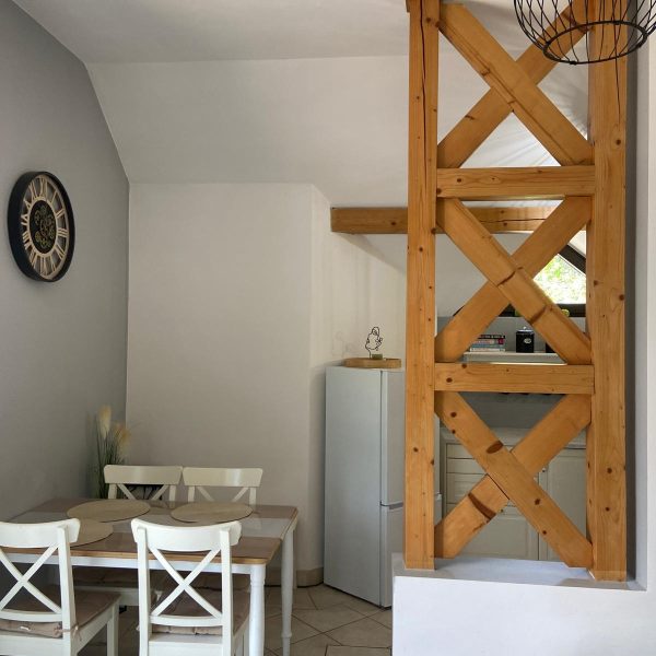 Wnętrze domku zostało zaprojektowane z myślą o wygodzie gości. Składa się z salonu z rozkładaną sofą i telewizorem z dostępem do serwisów streamingowych, oddzielnej, przytulnej sypialni oraz nowoczesnej łazienki z prysznicem. W pełni wyposażona kuchnia z lodówką i niezbędnym sprzętem kuchennym umożliwia samodzielne przygotowywanie posiłków. Całość posiada niezależne wejście oraz dostęp do szybkiego, bezpłatnego Wi-Fi.